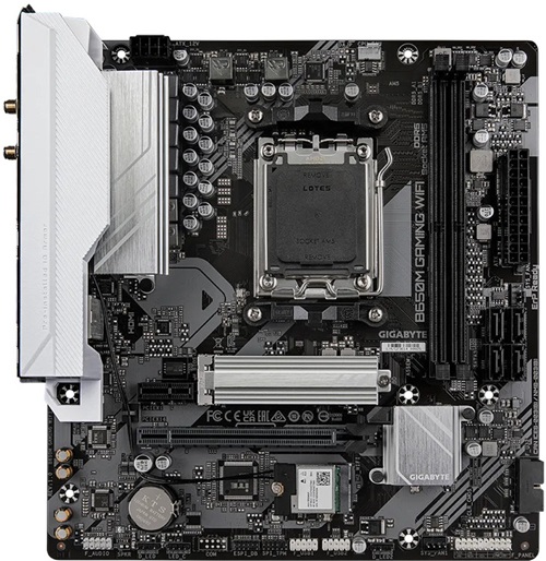 • ATX motherboard with AMD AM5 socket supporting latest Ryzen processors • 4x DDR5 memory slots for high-speed performance and upgrade flexibility • Storage: 3x M.2 slots and 4x SATA 6Gb/s with RAID support • Expansion: 3x PCIe slots for GPU and additional expansion cards • Connectivity: Gigabit LAN with built-in Wi-Fi 6 (AX) and Bluetooth • I/O: HDMI, DisplayPort, USB-C, plus USB-A and multiple USB 2.0 ports